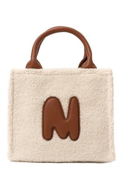 Сумку из текстиля, напоминающего овчину с густым ворсом, декорировали спереди контрастной нашивкой в виде литеры М. В тон ей выполнили короткие ручки и съемный плечевой ремень. Модель закрывается молнией.