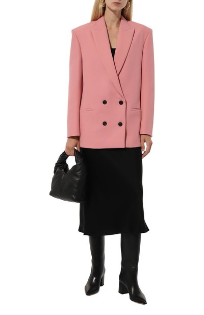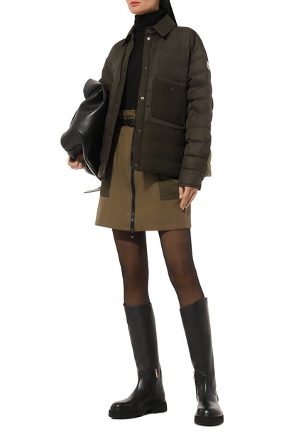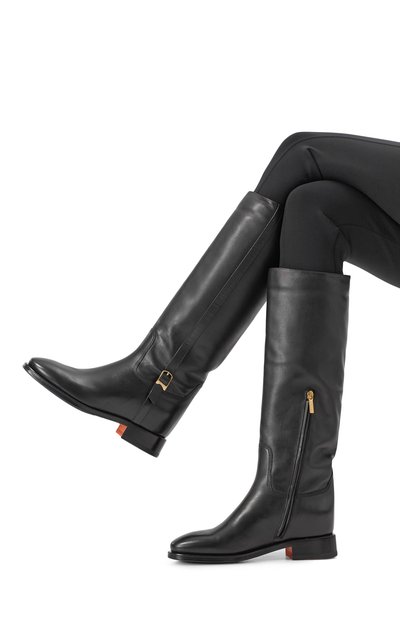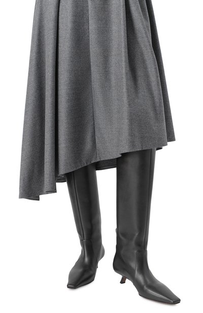Высокие сапоги на устойчивом каблуке выполнили из комбинации замши и гладкой кожи. Модель украсили ярким стежком и выгравированным логотипом на пуллере короткой боковой молнии.