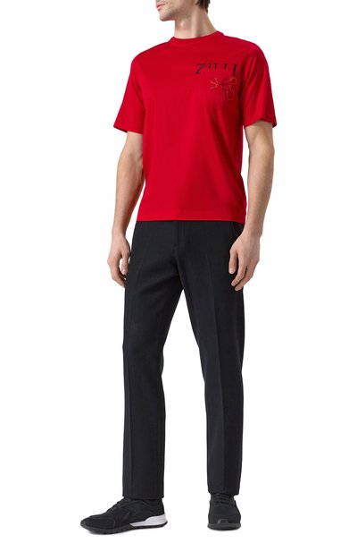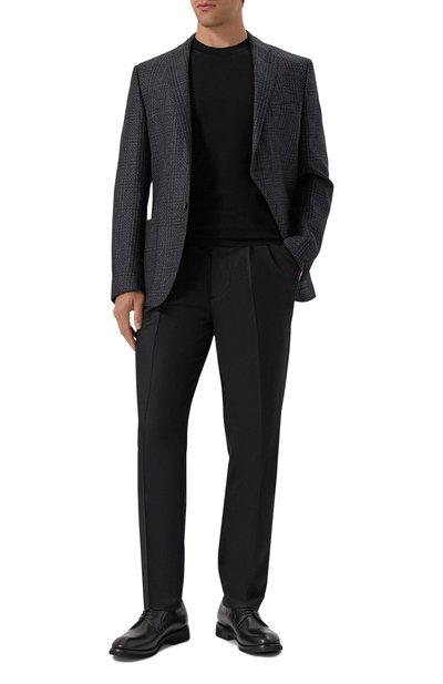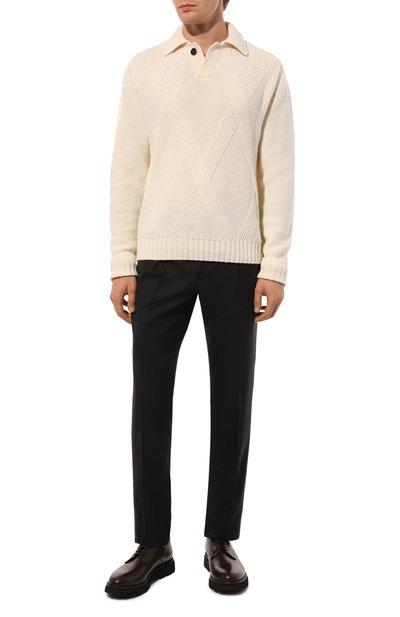Слегка зауженные брюки со стрелками и защипами дополнены эластичным поясом-кулиской. Для пошива модели с высокой посадкой и четырьмя врезными карманами использовали мягкую шерсть.
