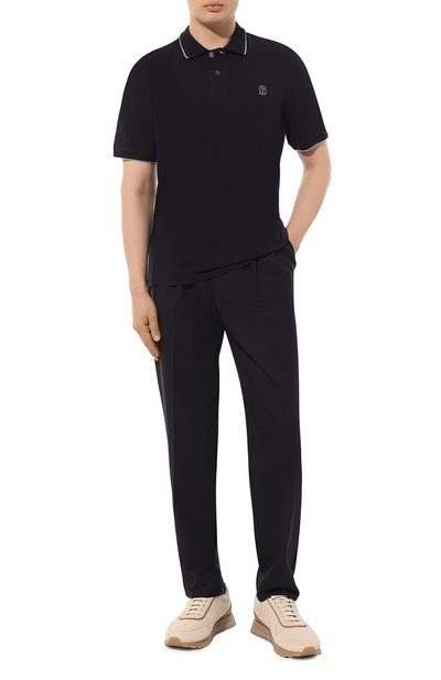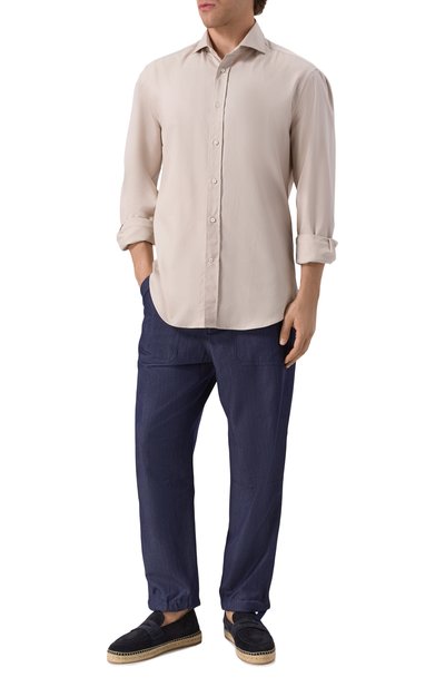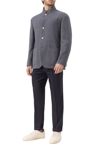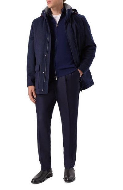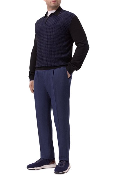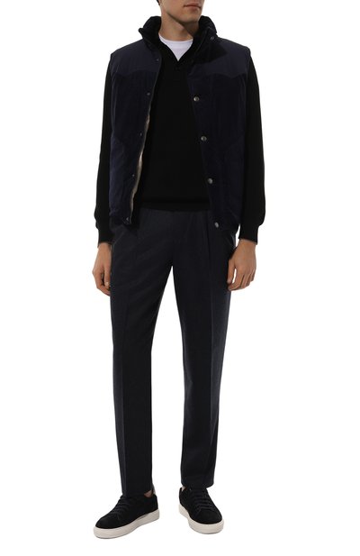 Брюки с двойными защипами и стрелками сшили из фланели на основе шерсти первого пострига. Модель с чуть заниженной линией шага дополнена четырьмя карманами и поясом-кулиской.
