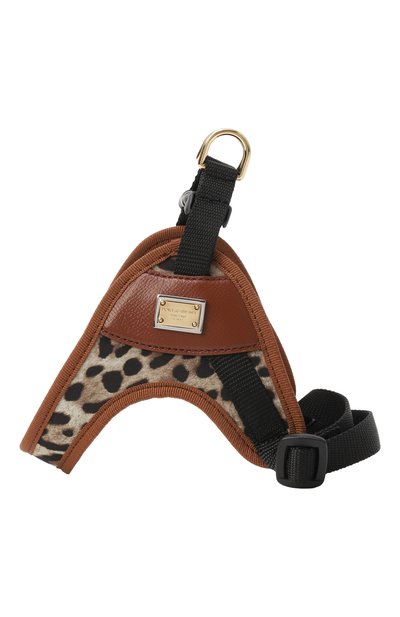 Текстильную шлейку с нейлоновыми рифлеными лентами дополнили сетчатым подкладом и кожаными деталями с брендированными пластинами. Аксессуар с металлическими полукольцами для крепления поводка регулируется слайдерами и застегивается пряжкой фастекс.
