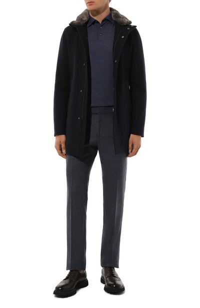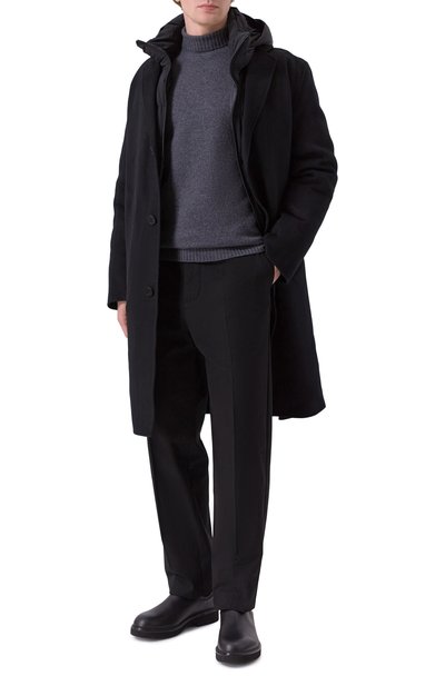 Однобортное пальто из полушерстяного материала застегивается брендированными пуговицами. Модель на синтепоне дополнили внутренним и внешними карманами, а также съемной манишкой с потайным капюшоном, ремешком и меховым воротником.