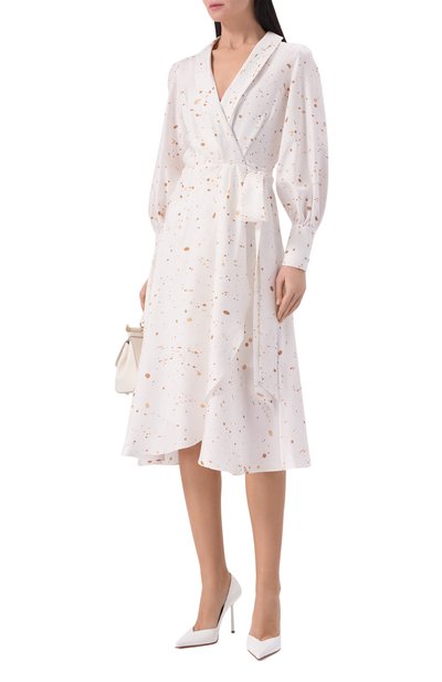 Платье-рубашку в сверкающую вертикальную полоску сшили из хлопково-шелковой органзы Sparkling Stripe. Модель с четырьмя накладными карманами и разрезами на подоле по бокам застегивается кнопками с кабошонами из рога буйвола. В комплекте — пояс-лента, формирующий приталенный силуэт, и нижнее платье в тон.