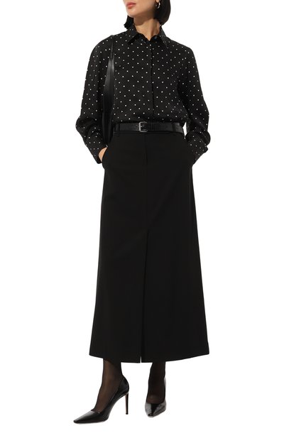 Свободную блузу со складкой на спинке, воротником аскот и викторианскими рукавами выполнили из ацетата с добавлением шелка. Нагрудный накладной карман украсили выложенной стразами эмблемой.