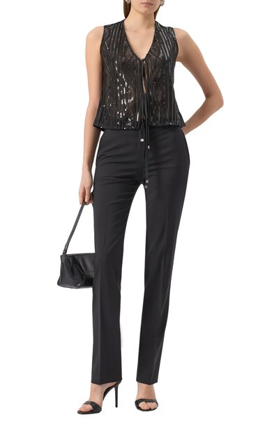 Облегающий жилет с глубоким квадратным вырезом сшили из эластичного шелкового атласа. Модель, застегивающаяся обтянутыми тканью пуговицами, идеально впишется в образ со смокингом или станет акцентной деталью в повседневном образе.