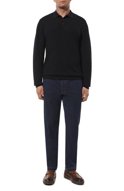 Поло из шерсти с добавлением шелка и кашемира застегивается короткой молнией с пуллером в виде фирменного октагона. Модель украсили геометрическим узором спереди, жаккардовой монограммой SR внизу и полосами по краям пояса, манжет и отложного воротника.