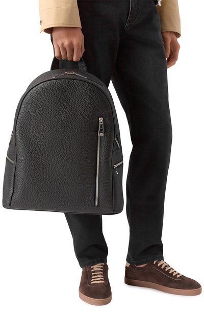 Рюкзак из зернистой телячьей кожи дополнили внешним карманом на молнии и внутренним слотом для смартфона. Аксессуар украсили фирменным октагоном с головой орла спереди и стеганым узором на задней панели.