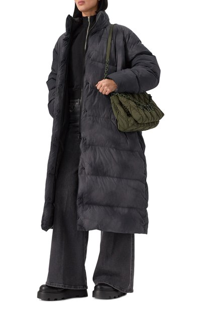 Стеганый пуховик из переработанного нейлона окрашен в готовом виде для создания пятнистого эффекта. В высоком воротнике-стойке спрятан тонкий капюшон. Куртка на утином пуху дополнена двумя врезными карманами и кулиской внизу. Левый рукав украшен вышитым логотипом марки.