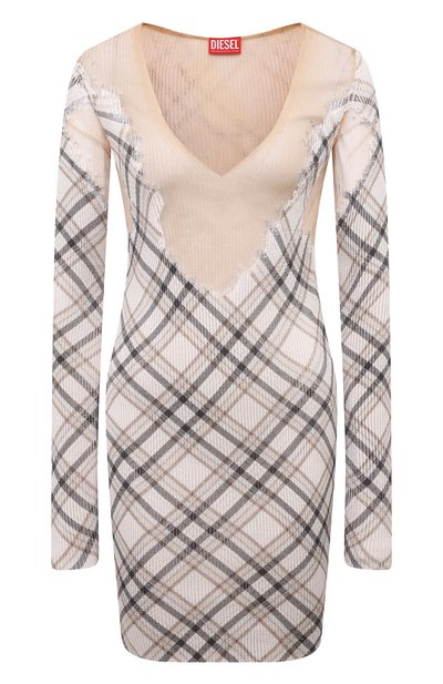 Клетчатое мини-платье M-Euripide сшили из эластичного ребристого трикотажа на основе хлопка. Готовую модель обработали в технике деворе, создав прозрачные участки с неровными краями вокруг декольте, на спинке и в области пройм.