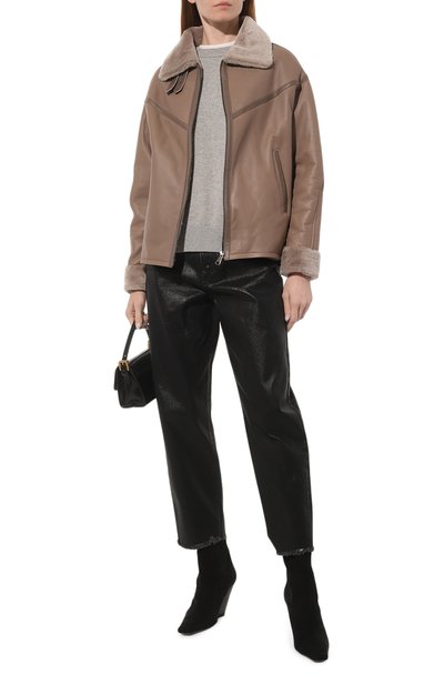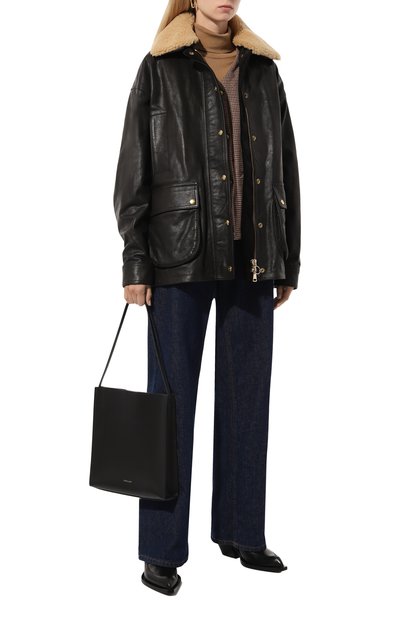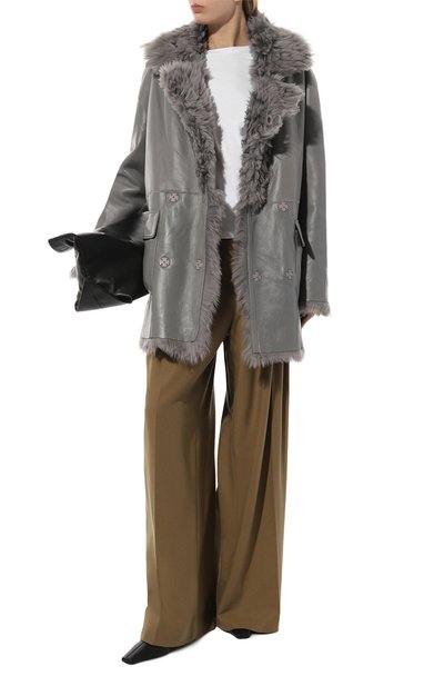 Дубленку выполнили из тонко выделанной овчины с крупнозернистой лицевой стороной и меховой изнанкой, видимой на отложном воротнике и по краю планки с кнопками. Куртку силуэта oversize дополнили регулируемыми патами на манжетах, боковыми и нагрудными карманами с клапанами.