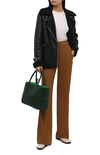 Диагональная молния спереди и прямые на манжетах придают дубленке сходство с косухой. Куртку с боковыми карманами выполнили из овчины с матовой лицевой стороной, отделку — из блестящей кожи в тон. Ремешок на воротнике позволяет застегнуть его наглухо.