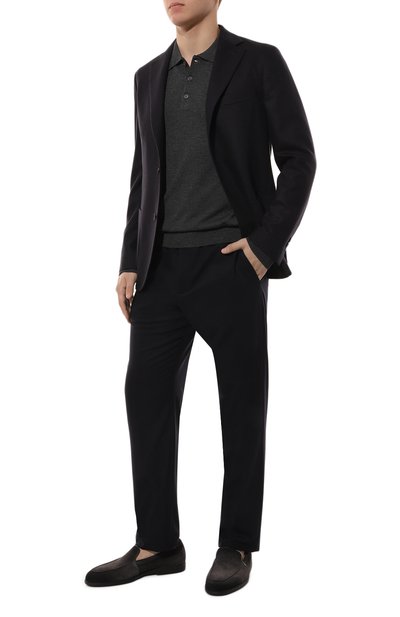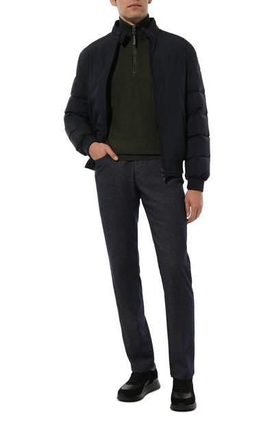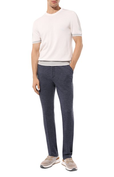 Брюки с боковыми карманами и накладным задним с кнопкой сшили из меланжевой полушерстяной ткани micro boucle. За удобную посадку на талии отвечает регулируемый пояс-кулиска, возле которого – D-образная петля для брелока.