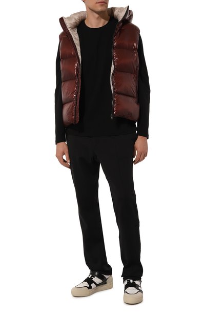 Стеганый жилет Anapa на встречной молнии выполнили из матового нейлонового рипстопа и наполнили утиными пухом и пером. Проймы окантовали эластичной брендированной лентой. Изделие с высоким воротником и парой боковых карманов украсили съемным брелоком, логотипом марки на груди и слэшем сзади.