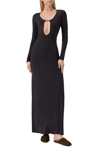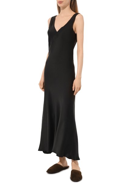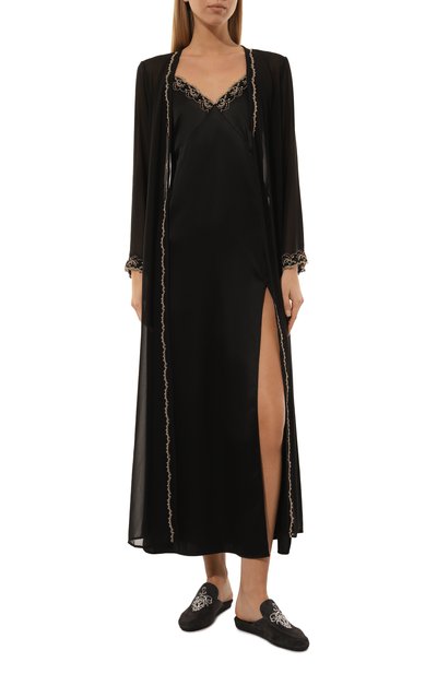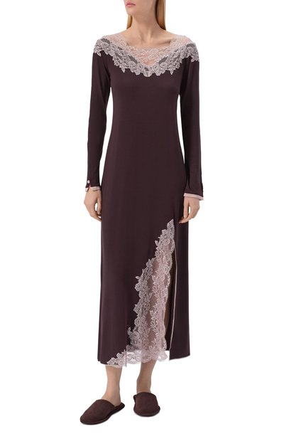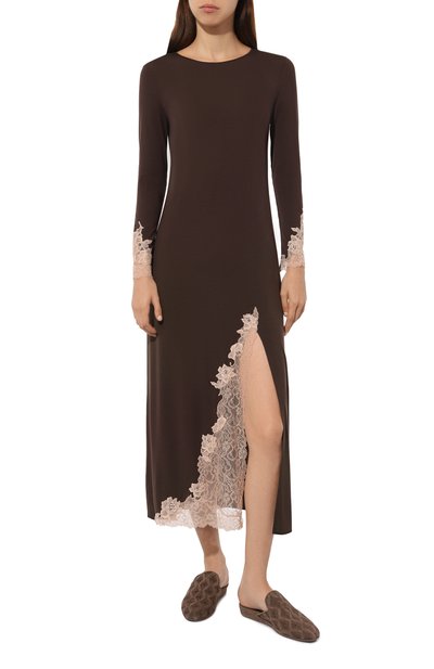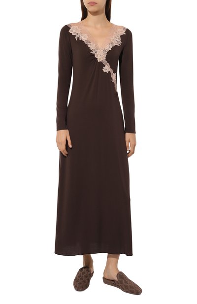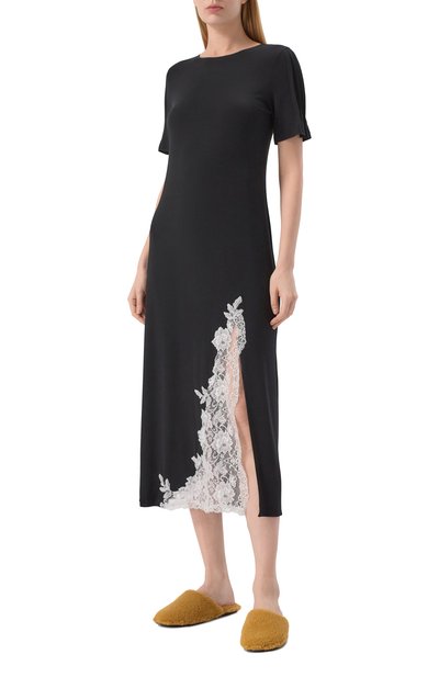 Сорочку с V-образным декольте выполнили из эластичного трикотажа на основе микромодала. Модель с тюлевой вставкой, дополненной вышивкой, украсили аппликацией из цветочного кружева Leavers.