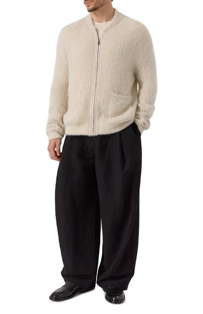 Кардиган с высоким воротом и смещенными назад плечевыми швами связали резинкой из шерстяной пряжи с добавлением кашемира. Сама модель, как и два прорезных кармана по бокам застегиваются скрытыми молниями.
