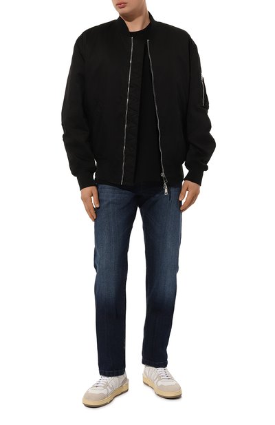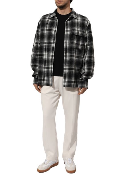 Принадлежность футболки бренду подчеркнули флокированным узором в виде логотипа и тотемного орла. Мотив создали на джерси из лиоцелла и хлопка, которое произвели в рамках проекта Armani Sustainability Values. Гладкой оставили только круглую горловину.