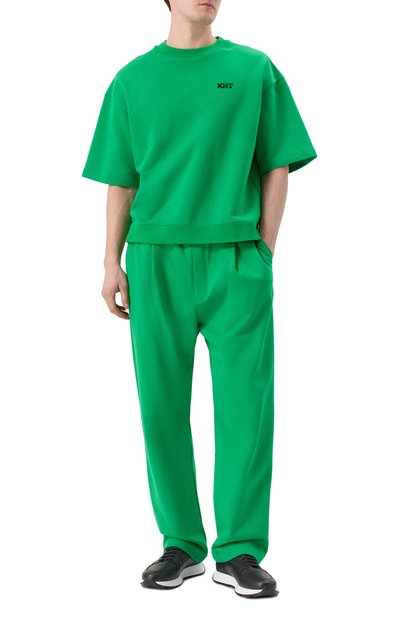 Брюки выглядят непринужденно за счет необработанных краев и декоративных разрывов, подчеркнутых контрастным подкладом. Модель с эластичным поясом и тремя карманами сшили из хлопкового трикотажа. О принадлежности бренду говорят числовой код на левой брючине и стежок сзади.