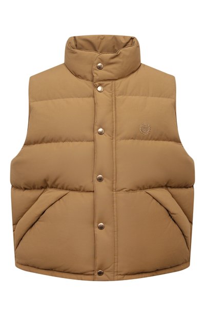 Стеганый жилет с высоким воротом, боковыми карманами и регулируемой кулиской снизу сшили из хлопковой ткани, укрепленной нейлоном. Модель на гусином пуху застегивается двусторонней молнией YKK, скрытой под штормовым клапаном с кнопками. Спереди нитью в тон вышили эмблему, сзади — логотип.