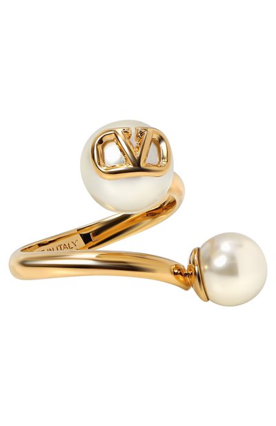 Узкое незамкнутое кольцо в виде спирали выполнили из латуни с золотистым финишем. Аксессуар украсили двумя перламутровыми сферами, одну из которых дополнили накладкой в виде эмблемы VLogo Signature.