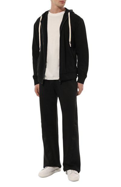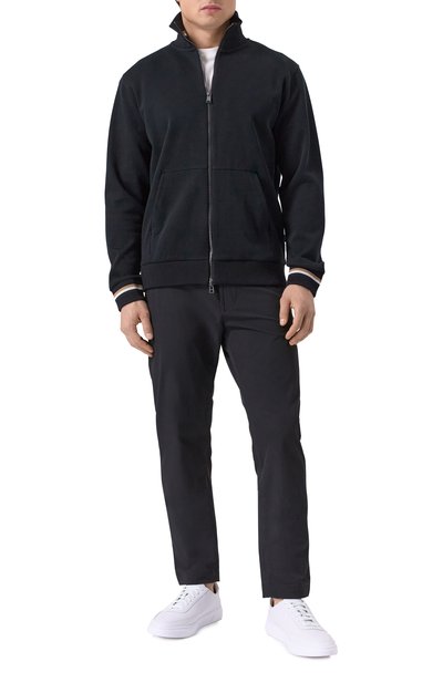Толстовку с воротником-стойкой и двумя врезными карманами сшили из хлопкового трикотажа, укрепленного нитями полиэстера. Модель, застегивающуюся молнией, украсили спереди патчем с эмблемой Double B.