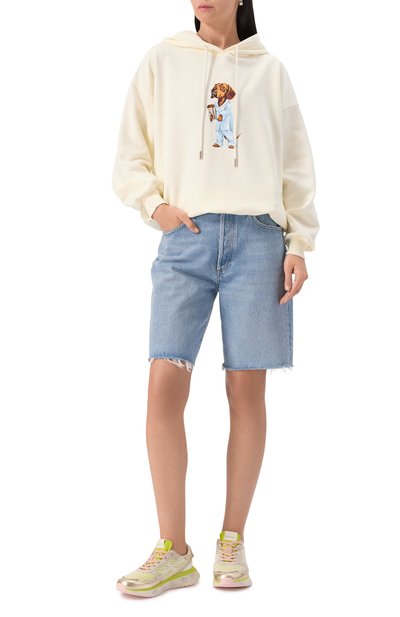 Худи из хлопка френч терри, частично выполненного из органического сырья, украсили фетровым патчем с логотипом из кристаллов. Пояс выполнили из ре бристого трикотажа сзади, а спереди превратили в кулиску с широкой лентой.
