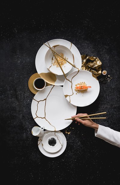 Фарфоровая тарелка с золотистой отделкой дополнена черно-белым изображением моряка. О принадлежности модели знаменитой серии Tema e Variazioni сообщает совершенное лицо Лины Кавальери на одной из его татуировок. Изделие с декором ручной работы можно использовать как настенное украшение — на обратной стороне есть отверстия для подвеса.