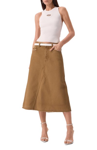 Для пошива облегающей майки использовали ребристый трикотаж на основе хлопка и модала. Модель с круглым вырезом украшена спереди металлическим логотипом бренда. Модель универсального цвета удачно пополнит повседневный гардероб.