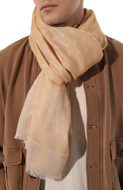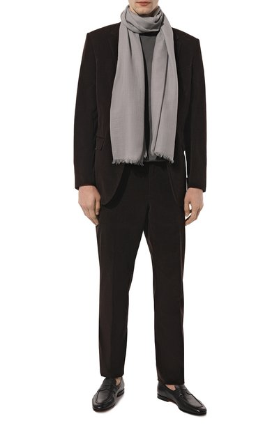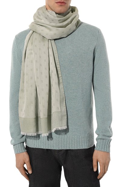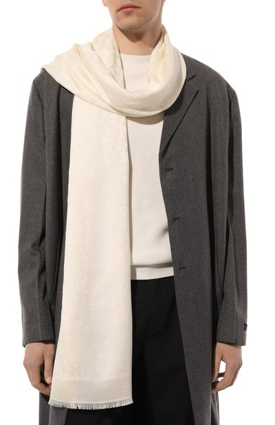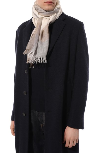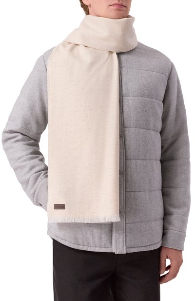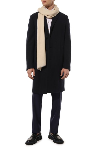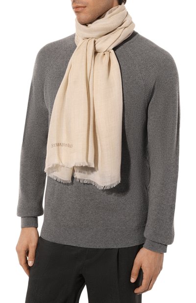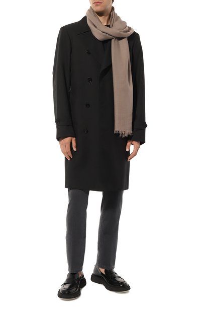 Для изготовления широкого шарфа использовали тонкий твил из чистого кашемира. Модель с короткой бахромой декорировали небольшим брендированным патчем.