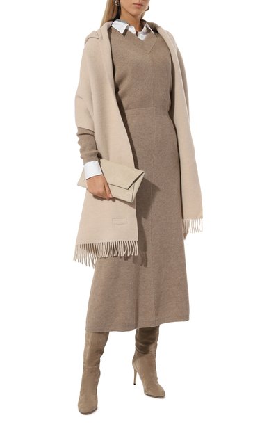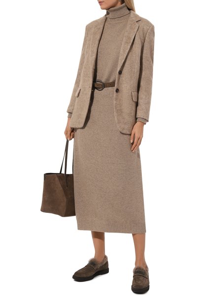 Свободное кашемировое макси-платье с высокой горловиной, как у водолазки, дополнили рифлеными манжетами с разрезами. Блеск модели придали цепочками мониль, пришитыми вручную вдоль рукавов и плеч.