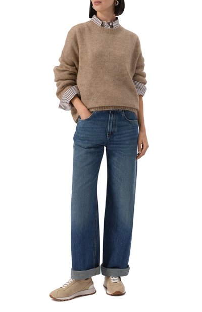 Свитер с круглой горловиной выполнили из ворсовой пряжи на основе мохера и шерсти, смешанных с кашемиром, шелком и полиамидом. Модель свободного силуэта украсили ромбовым узором Dazzling Argyle из миниатюрных пайеток.