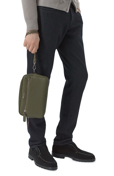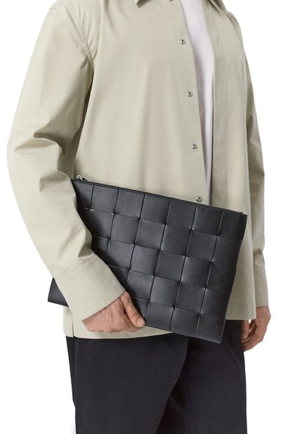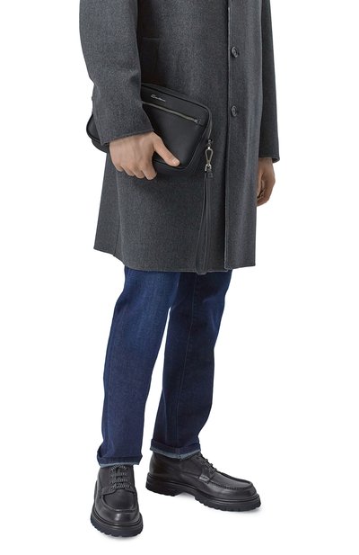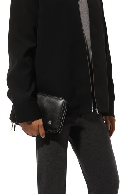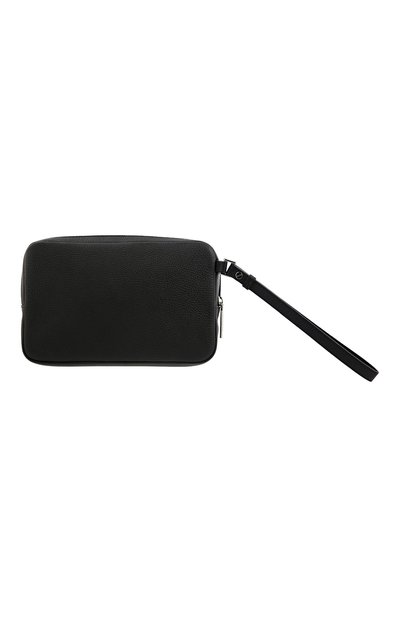 Клатч со съемной ручкой-петлей выполнили из гладкой телячьей кожи. Внутри — карман на молнии и прорезной, а также слот для карты. Модель украсили спереди пластиной с выгравированным логотипом бренда.