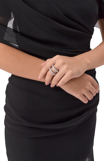 Кольцо Hyperbola, вдохновленное символом бесконечности, можно носить любой стороной вверх. Всю поверхность фигурного аксессуара из латуни с гальваническим покрытием родием инкрустировали циркониями.