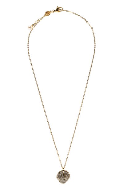 Колье-цепочка Idyllia и медальон-раковина выполнены из позолоченной латуни. Подвеска, инкрустированная внутри и снаружи прозрачными кристаллами на черном фоне, открывается, демонстрируя перламутровую бусину-жемчужину.