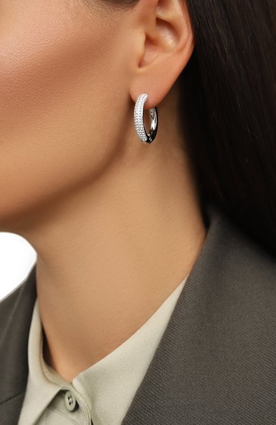 Серьги Hyperbola с застежками-пусетами выполнили из латуни. Модель, словно собранную из четырех полуколец, украсили цирконием, оставив одно из них без декора..