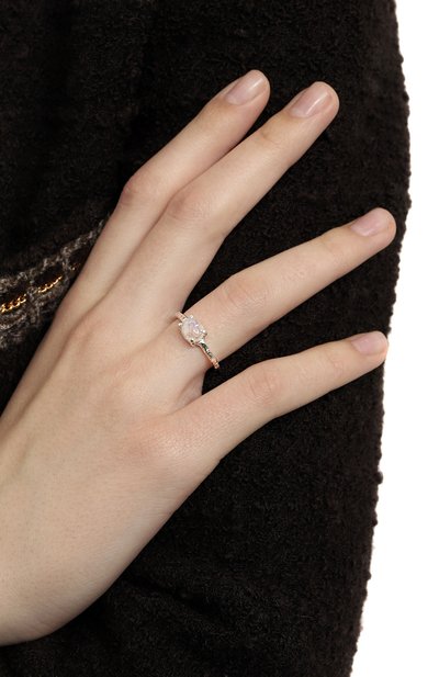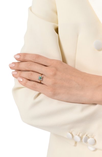 Кольцо из коллекции Gema выполнили из латуни с гальваническим покрытием родием. Аксессуар украсили четырьмя кристаллами разных форм и оттенков.