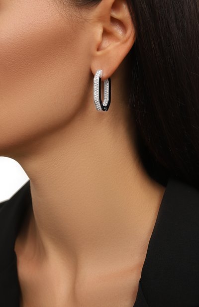 Серьги-кольца Lucent с шарнирной застежкой выполнили из полированного алюминия. Аксессуар в форме октагона декорировали прозрачными кристаллами.