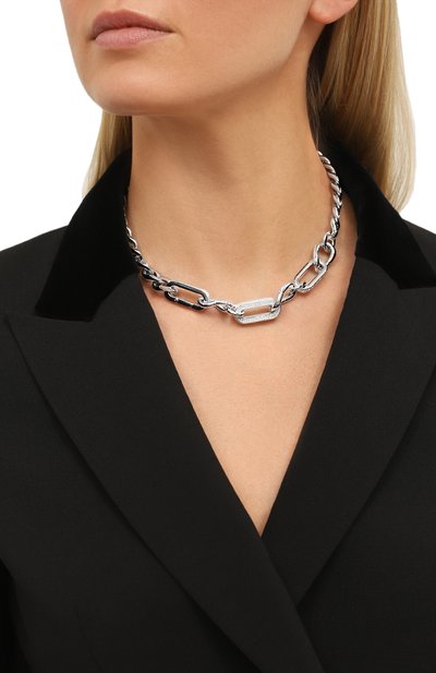 Колье Millenia, застегивающееся карабином, выполнили из латуни с гальваническим покрытием родием. Украшение декорировали прозрачными кристаллами восьмиугольной огранки.