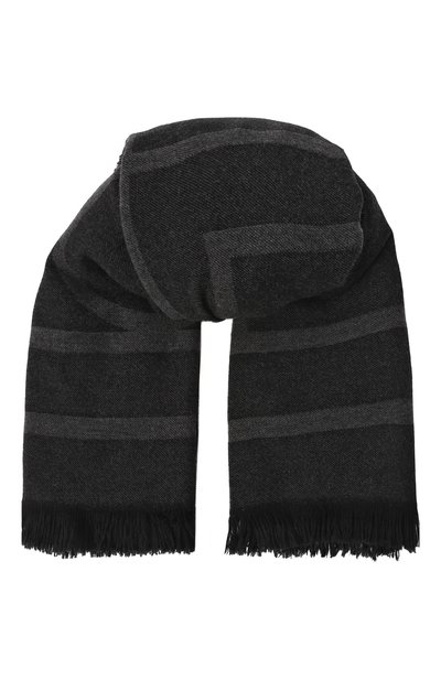 Шарф с жаккардовым логотипом на пару тонов светлее выполнили из шерсти первого пострига с добавлением кашемира. Края большого квадратного аксессуара украсили бахромой.