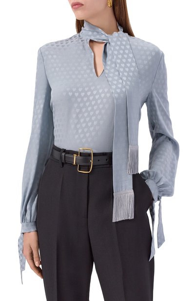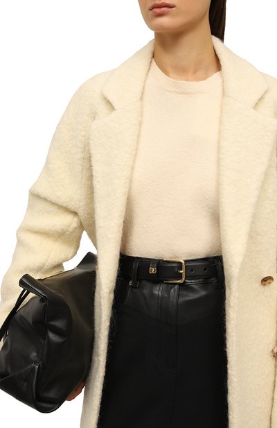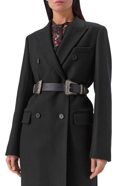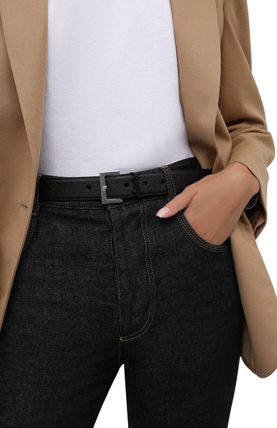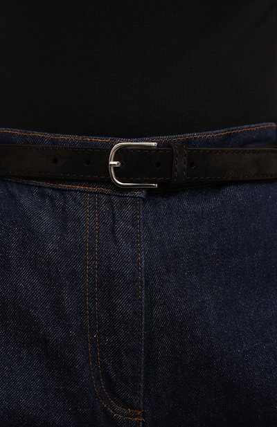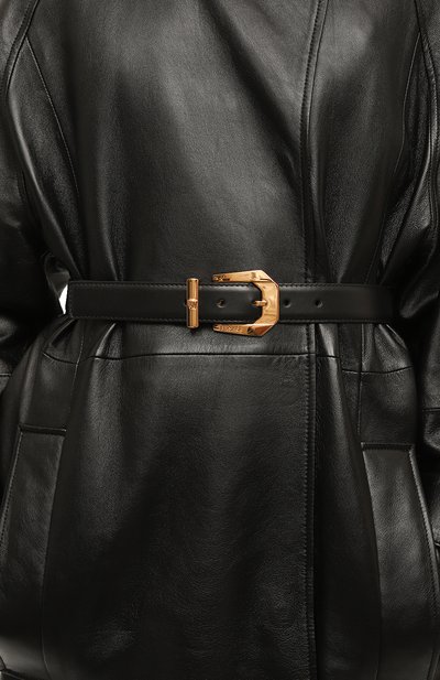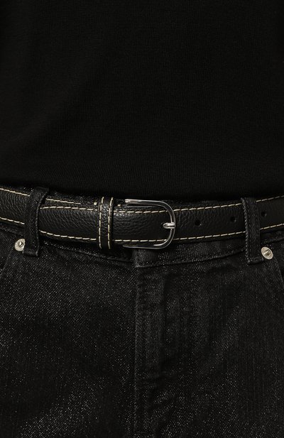 Узкий ремень, прошитый контрастной строчкой, выполнили из крупнозернистой яловой кожи. Аксессуар с тренчиком в тон застегивается полукруглой серебристой пряжкой.