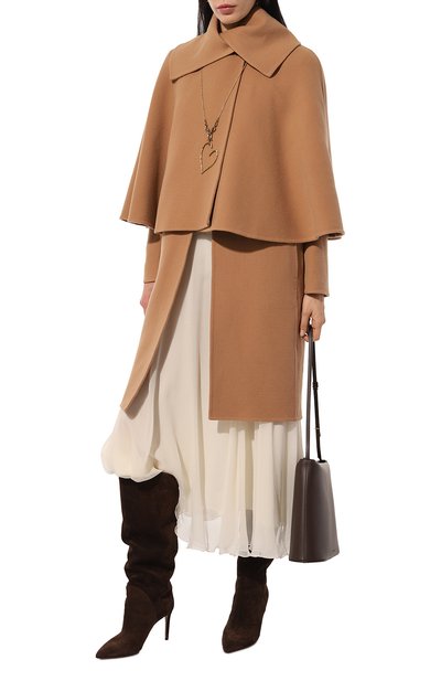 Сапоги Gaia с зауженным мысом и шпилькой средней высоты выполнили из замши. Благодаря широкому фигурному голенищу пара не нуждается в застежке.