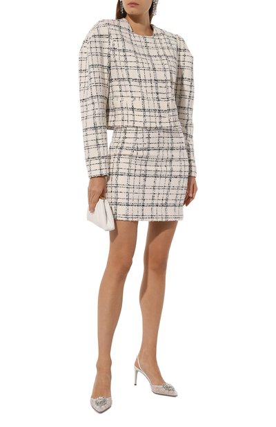 Мини-юбка сшита из твида с мерцающим блеском. Модель застегивается сзади потайной молнией. Наши стилисты предлагают создать образ с парным жакетом и туфлями на каблуке.