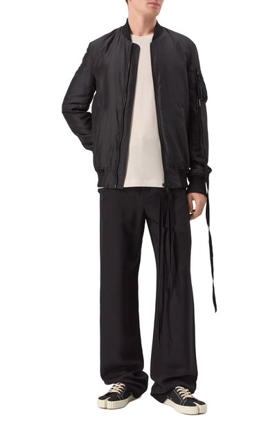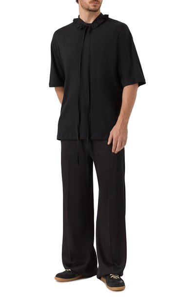 Широкие брюки со стрелками, двумя боковыми и задним прорезным карманами сшили из лиоцелла. Пояс со шлевками дополнили кулиской со шнуром, помогающим отрегулировать посадку на талии.