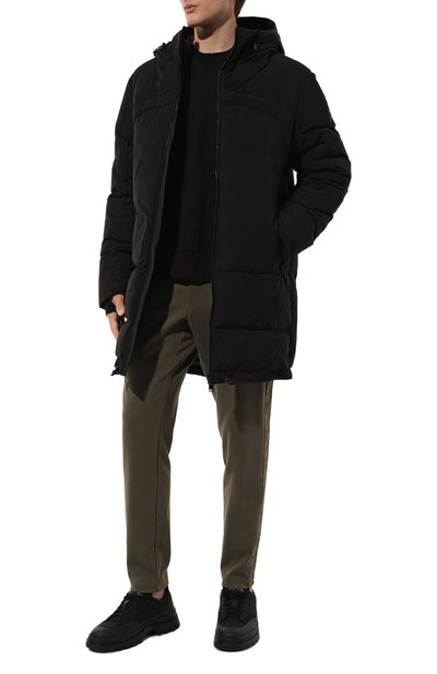 Свободную куртку с капюшоном, боковыми карманами и эластичными манжетами выполнили из непродуваемого полиэстера. Утепленная гусиным пухом модель с прорезиненным брендированным патчем на груди застегивается встречной молнией.