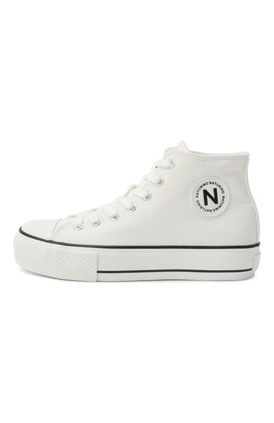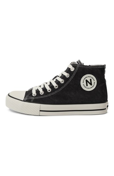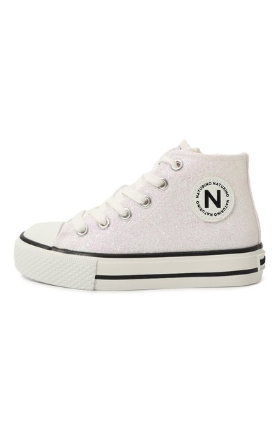 Высокие кеды YLFAS с усиленным мысом сшили из текстиля, покрытого глиттером. Пару с брендированными патчами сбоку и на язычке установили на широкую подошву с контрастным кантом. Посадка регулируется шнуровкой, сама обувь застегивается молнией.