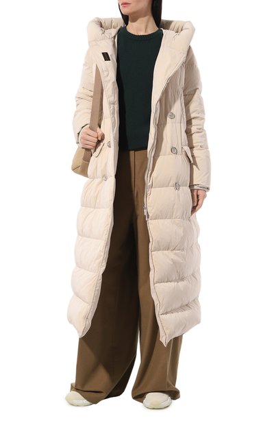 Для пошива длинного пуховика Magda-OS с капюшоном со съемной меховой отделкой использовали смесовую ткань из полиамида и полиэстера. Модель с боковыми разрезами, регулируемыми молниями, дополнили двумя боковыми карманами на кнопках. В манжеты и нижний край встроены резинки.