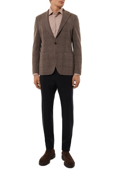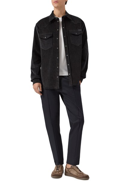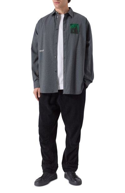 Рубашку с шевронным узором выполнили из микса хлопка и лиоцелла. Клапаны двух нагрудных карманов дополнили вставками, на одной из которых вышили логотип бренда. Рукава можно подвернуть и зафиксировать узкими ремешками.