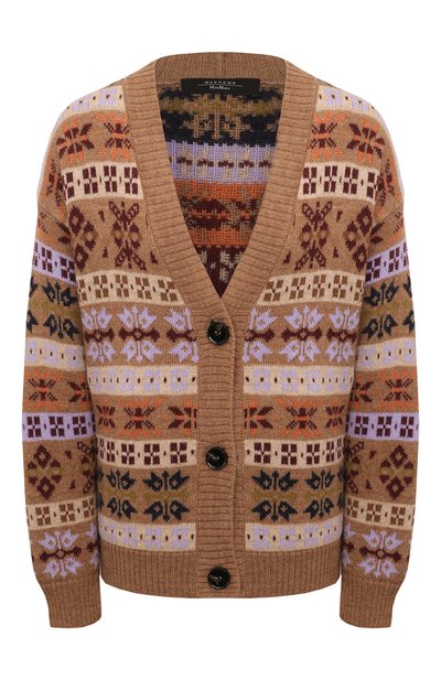 Кардиган со спущенной линией плеч и глубоким V-образным вырезом связали из тонкой пряжи с шерстью, альпака и акрилом. Модель с жаккардовым узором застегивается крупными роговыми пуговицами.