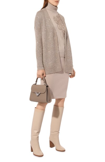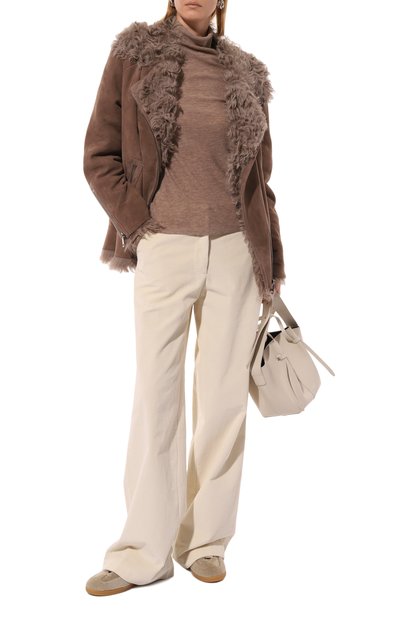 Для изготовления водолазки Meana использовали чистый кашемир. Модель с высоким воротом, поясом и манжетами в рубчик органично впишется в базовый гардероб.