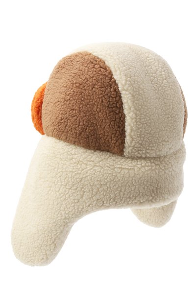 Шапку-ушанку сшили из дубленой овчины с коротковорсовым мехом, видимым на отвороте. Длинные наушники и широкая вставка сзади защищают шею от ветра и холода.