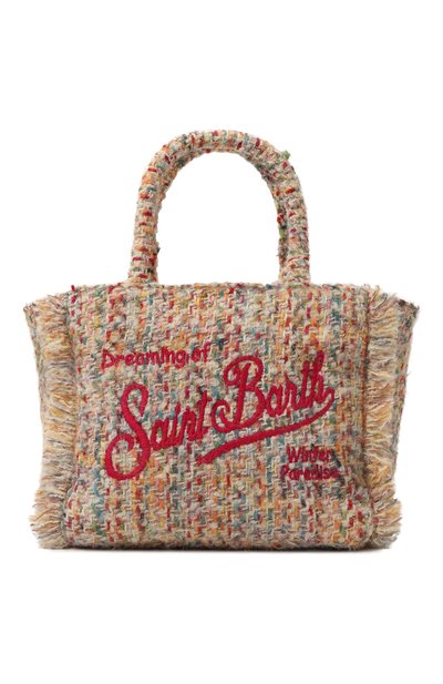 Прямоугольную сумку с бахромой и вышитым логотипом спереди и сзади сшили из полушерстяного твида, усиленного полиэстером. Аксессуар с двумя короткими ручками и съемным плечевым ремнем, а также внутренний карман застегиваются молниями.